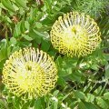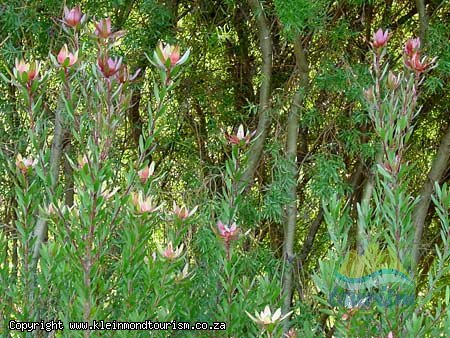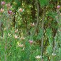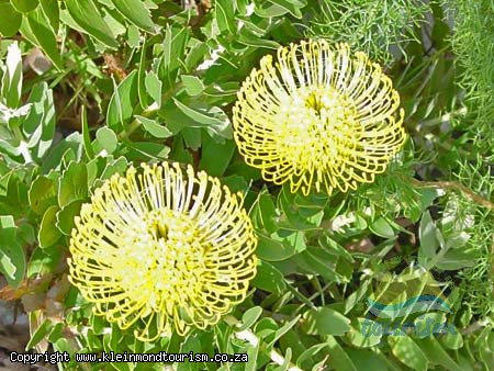 PROTEOID FYNBOS ... Proteas, a major feature in this fynbos type, are usually larger than the surrounding vegetation with deep root systems enabling them to survive on the dryer mountain slopes. Many species have a restricted distribution: long-leaf sugarbush, oval-leaf pincushion and nodding pincushion occur only on shallow sands on sandstone. The protea was named after the Greek god Proteus, who was able to change his appearance at will, and members of the protea family also take on a wide variety of forms, from the typical leathery-leafed protea to the cone-bearing plants, pincushions and delicate, feathery serrurias. The species with the largest flowerhead is the king or giant protea, South Africa's national flower, whose flowerhead may reach 30 centimeter in diameter. Each protea flower is in fact a flowerhead which serves as a point of attachment for many small flowers, and as a landing platform for birds attracted to their nectar. Only two small populations of the marsh rose, the rarest protea, survive in high, inaccessible areas in the Kogelberg and Kleinriviers mountains. Protea susannae, a second, localised type of proteoid veld that occurs on deep, more fertile sands, is highly endangered due to invasion by alien rooikrans and port jackson willow. The third, distinctive form of proteoid fynbos occurs exclusively on limestone outcrops of the Bredasdorp Formation, from Gansbaai to the Gourits River mouth, where the soils are sandy and shallow, rich in organic matter and nitrogen but infertile and often confined to small potholes in the limestone pavement.