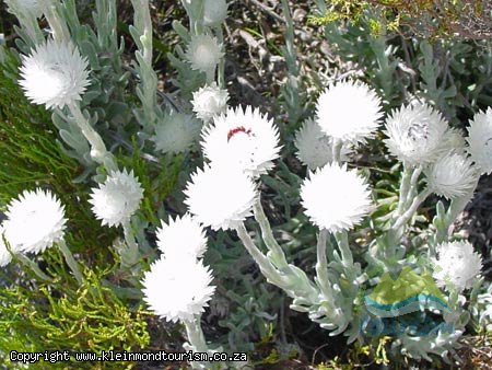 HEATHY FYNBOS ... Also known as ericaceous fynbos due to the dominance of the erica family, heathy fynbos occurs on shallow, sandy, acid soils that are highly infertile and is extensively found in moister areas such as natural seeps and marshes on steep, south-facing mountain slopes. Ericas use fungi in a symbiotic (mutually beneficial) relationship to absorb moisture instead of root-hairs and in return provide the fungi with sugar. Other interesting plants in this habitat are the mountain bluebell; now under threat, the flame-red Bredasdorp lily, found only on the Bredasdorp mountain, especially after fires; the large red disa, growing in damp kloofs in the Harold Porter Nature Reserve; the granny bonnet, an orchid that uses a rich oil to attract its pollinator, a bee; and the Cape or tinder everlasting (matras sewejaartjie) whose large, white flowers were once used to stuff mattresses. Everlastings are commercially important for the dried flower industry.