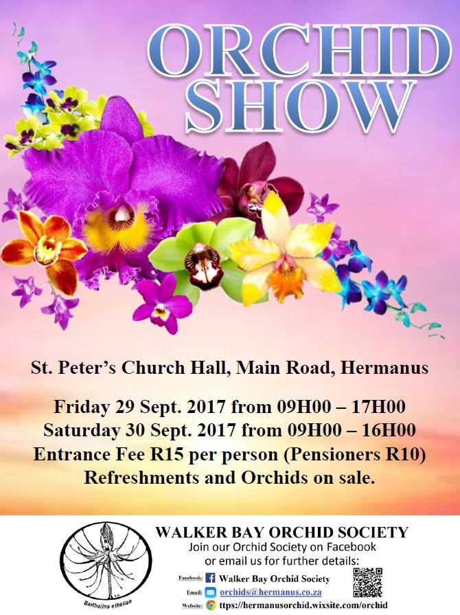 Opening times for the Orchid Show in St Peter's Church Hall, Main Road, Hermanus are 09h00-17h00 on the 29th and 09h00-16h00 on the 30th. Entrance fee is R15 per persion (R10 per pensioner). Refreshments and orchids on sale. Contact orchids@hermanus.co.za or join us on Facebook for further details.